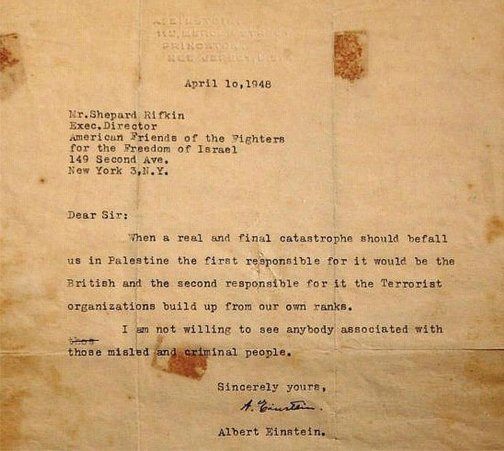 El comunicado publicado por esos intelectuales en diciembre de 1948 en el New York Times, en referencia los colonizadores en Palestina, en el nuevo Estado de Israel creado por la ONU, dice lo siguiente: